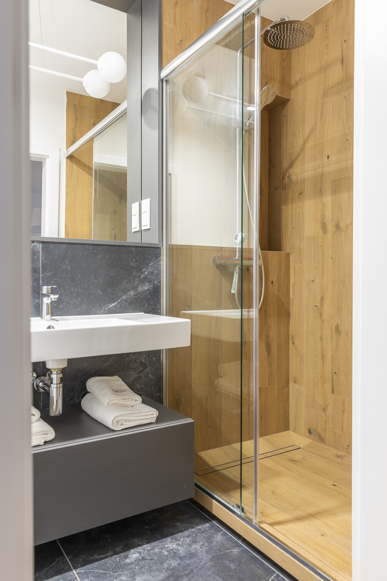 Łazienka: nowoczesna, z kabiną prysznicową, pralką oraz suszarką.